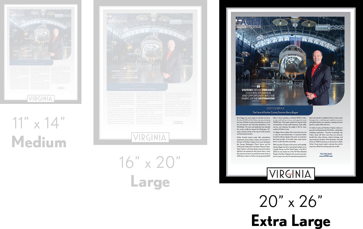 The 26 x 20 Faces of Virginia 2025 plaque is being produced exclusively for Virginia Living’s Faces of Virginia produced in the November/December 2025 issue. Your page reproduction, which is printed with archival-quality ink and covered in a protective clear laminate, is the perfect way to promote the excellence of your business for all to see! Accept no substitutes; Virginia Living’s Faces of Virginia 2025 plaques are the only official plaques.