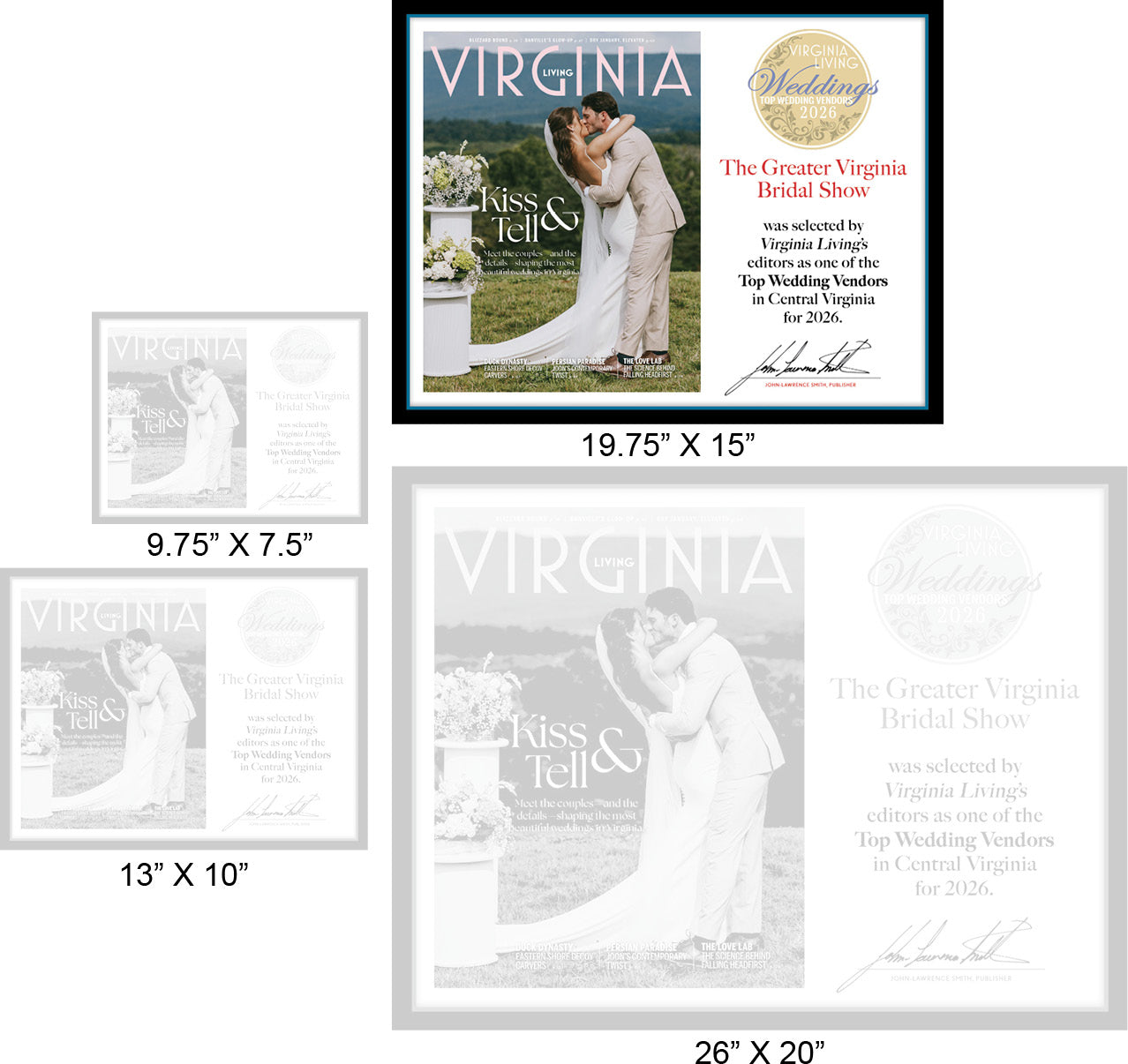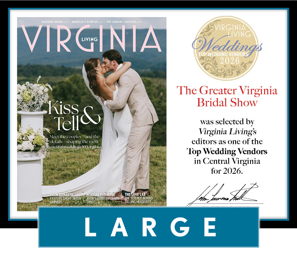 The 19.75 x 15 Top Wedding Vendor 2026 plaque is being produced exclusively for businesses named to the Virginia Living Weddings Top Wedding Vendors 2026 list. Personalized with the winner’s name, category won and region, this plaque, which is printed with archival-quality ink and covered in a protective clear laminate, is the perfect way for winners to let their customers know that Virginia Living chose their business as one of the best in Virginia! Accept no substitutes; Virginia Living’s Top Wedding Vendor 2026 plaques are the only official winner's plaque.