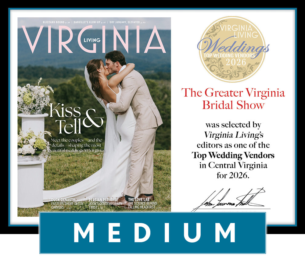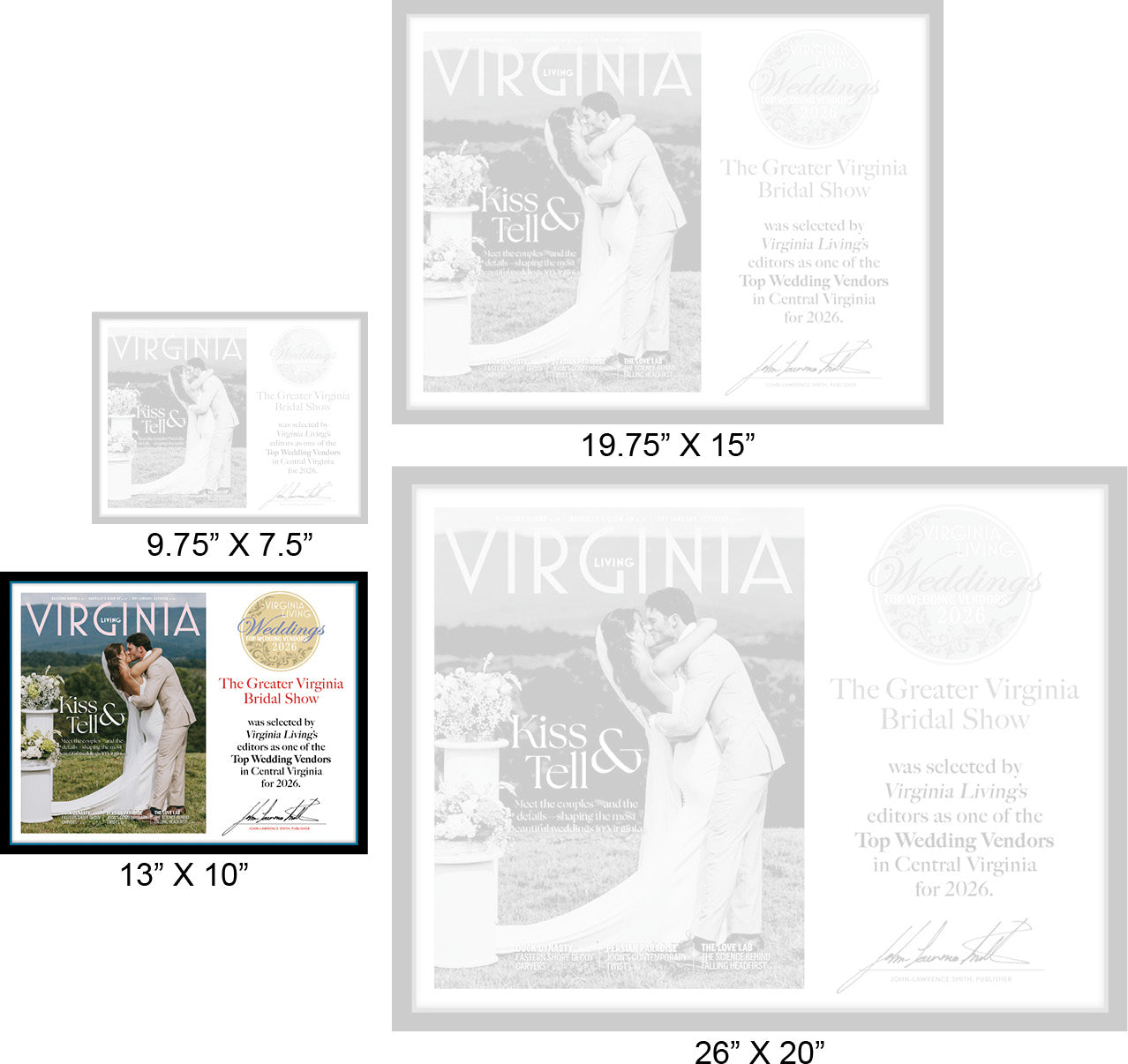 The 13 x 10 Top Wedding Vendor 2026 plaque is being produced exclusively for businesses named to the Virginia Living Weddings Top Wedding Vendors 2026 list. Personalized with the winner’s name, category won and region, this plaque, which is printed with archival-quality ink and covered in a protective clear laminate, is the perfect way for winners to let their customers know that Virginia Living chose their business as one of the best in Virginia! Accept no substitutes; Virginia Living’s Top Wedding Vendor 2026 plaques are the only official winner's plaque.