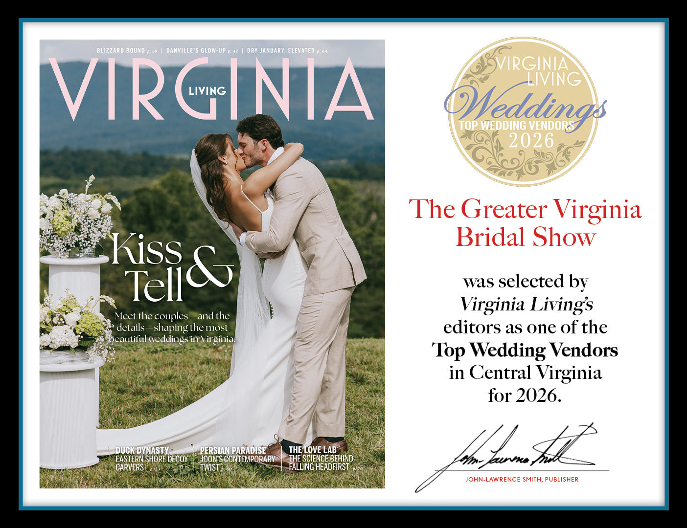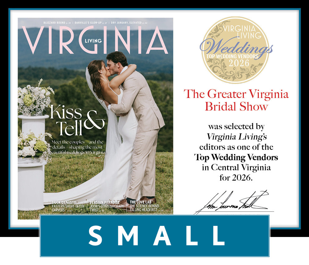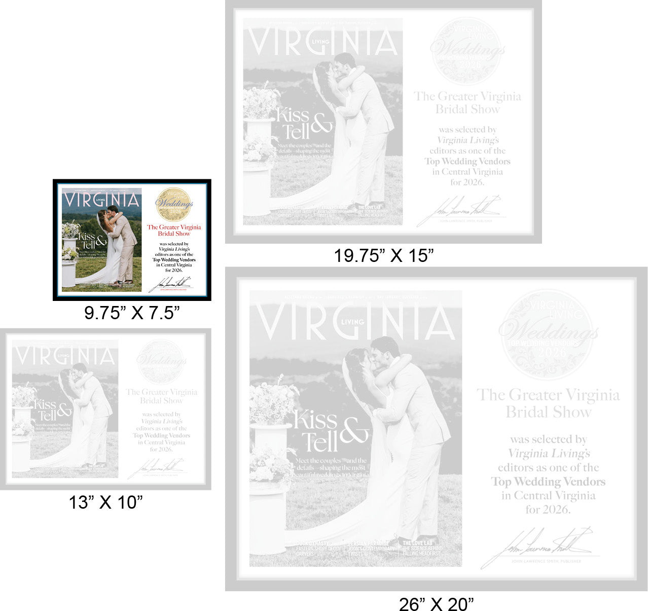 The 9.75" x 7.5" Top Wedding Vendor 2026 plaque is being produced exclusively for businesses named to the Virginia Living Weddings Top Wedding Vendors 2026 list. Personalized with the winner’s name, category won and region, this plaque, which is printed with archival-quality ink and covered in a protective clear laminate, is the perfect way for winners to let their customers know that Virginia Living chose their business as one of the best in Virginia! Accept no substitutes; Virginia Living’s Top Wedding Vendor 2026 plaques are the only official winner's plaque.