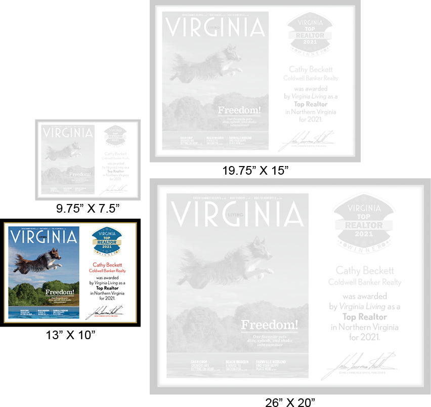 The 13 x10 Top Realtor 2021 plaque is being produced exclusively for honorees of Virginia Living's Top Realtor 2021 special advertising section. Personalized with the honoree's name, this plaque, which is printed with archival-quality ink and covered in a protective clear laminate, is the perfect way to let your potential home buyers know that you were chosen as one of the Top Realtors in Virginia! Accept no substitutes; Virginia Living's Top Realtor 2021 plaques are the only official honorees plaques.
